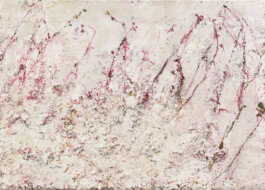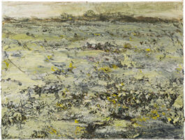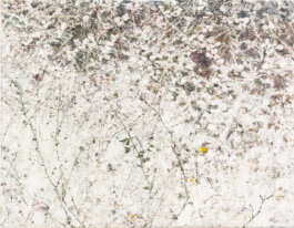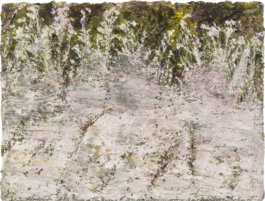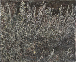 In the large paintings Klinkhamer followed the procedure of applying material,scraping it away, filling up the crevices and painting over then again. From nearby it looked as if the had spread fat daubs of paints, endlessly and seemingly at random, all over the canvas until they coagulated into a thick of paint. From a distance the vegetative impressions seemed to disentangle themselves slowly, and when the diffuse light from outside brushed along the pockmarked coats of paint, portrayed nature even seemed to come alive. During my engrossed observation the thick coats of paint slowly dissolved and then I merely saw how light and shadow played together in the dense shrubbery.