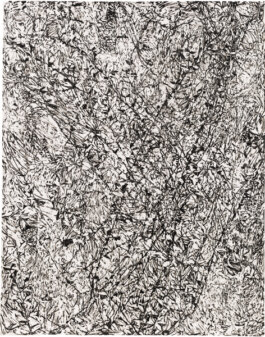 The works on canvas, as well as those on paper, showed fragmentary impressions of shrubbery, plants and grasses. Sometimes they concentrated around a number of powerful main shapes, but mostly they merged into wild whirling of dabs of paint or criss-crossed lines and leaf patterns. The works on paper mostly existed of several layers of paint. Some were initially completely painted in black, after which the artist scraped and cut into the thick paper with a sharp knife, so that white shapes appeared. In his need to penetrate into the paper he often went so far thatdeep holes were created, which he consequently covered by gluing other sheets of paper to the back. And so layered painting on paper came into being with form structures in black and white, which produced a very vivacious, sometimes almost vibrate, three-dimensional mosaic. The continuing diversity of positive and negative lyrized picture fragments constantly put focussing on the proof and made experiencing these paintings into an interactive adventure.