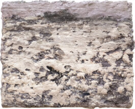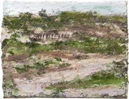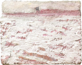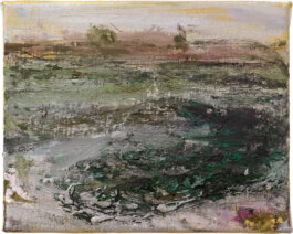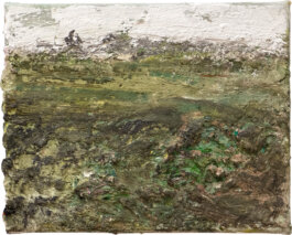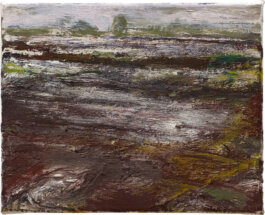 The makeshift lighting revealed a relief which had not been visible on the pictures in the catalogue nor on the site. Contrary to what I had originally thought, Han Klinkhamer’s paintings are not portrayals of landscapes but oil paint sculptures which, by composition, form, colour and relief, evoke the idea of a landscape. They do not have a frame which, like a window, suggests a view of the fields outside. The painting itself is the field; clods of earth stick out on all sides. Even the clouds are oily and pasty. The paint used is oil paint, not acrylic paint. What clay is for the fields, oil is for paint. I smell the painting, let my fingers glide over it. If I were blind, I would be able to read it like braille.